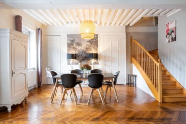 L'appartement brouille les pistes, mixant déco classique, romantique et contemporaine. Les matières chaleureuses et naturelles se répondent. Des couleurs douces et enveloppantes mettent en valeur le véritable chef d'œuvre : la vue. Il faut dire que depuis les nombreuses fenêtres de l'appartement, le spectacle des lumières est permanent. Elles changent et peignent sur Fourvière, le théâtre des Célestins et les ocres florentins du vieux Lyon, des couleurs différentes à chaque heures de la journée.