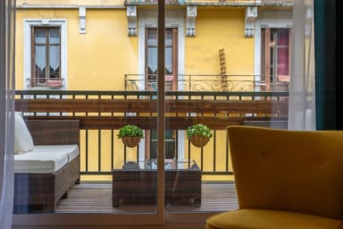 Très grand séjour avec magnifique cuisine ouverte toute équipée pour préparer vos repas comme à la maison. Le séjour s'ouvre sur une belle terrasse équipée d'un salon de jardin avec vue sur les bâtiments typiques et colorés de la vieille ville.