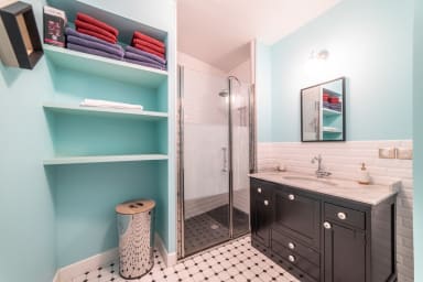 Très belle salle de bain avec grande douche et WC séparés.