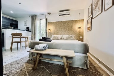 De plain-pied, notre gîte Casa Natura (N°2) est composé d'un confortable couchage 160 x 200 cm (2 lits jumeaux), d'une cuisine équipée, d'une salle de douche, de rangements, d'une terrasse exposée plein Ouest avec bains de soleil et d'une table de jardin. Un stationnement privatif vous est également réservé.