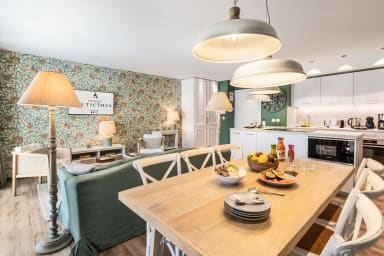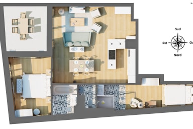 - Espace repas : une grande table pouvant accueillir jusqu’à six convives à l’intérieur comme à l’extérieur.