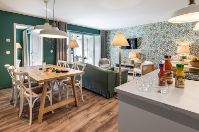 - Afin d'accueillir 2 personnes supplémentaires (6 personnes max/appartement) - un couchage dans le salon avec le canapé lit convertible 160 x 190 cm est possible sous réserve de la confirmation de la Résidence.