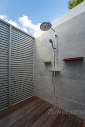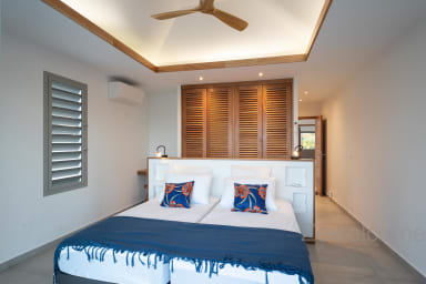 2 grandes chambres climatisées avec salle d'eau privative ouverte sur le ciel. Vivez l'apogée du bonheur aux Antilles, en vous rafraichissant sous la douche avec vue sur les étoiles.