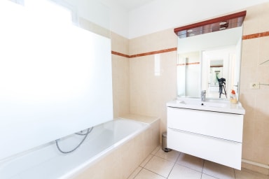 • SALLE DE BAIN : Baignoire et meuble avec vasque.