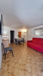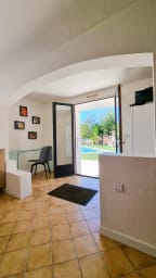 - 1 Séjours avec canapé, table à manger, télévision donnant sur la terrasse face à la piscine.