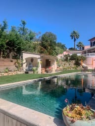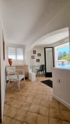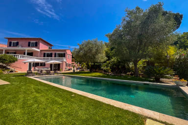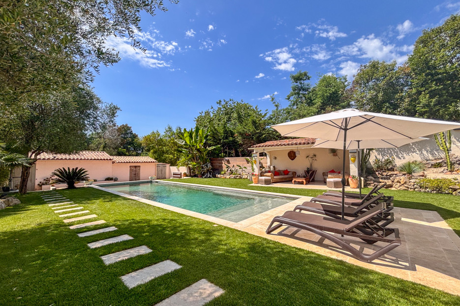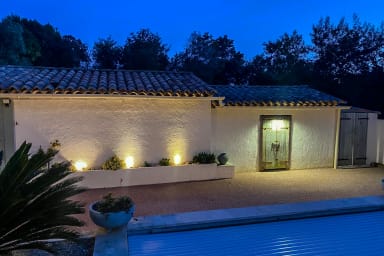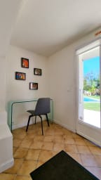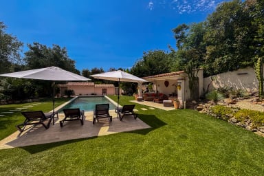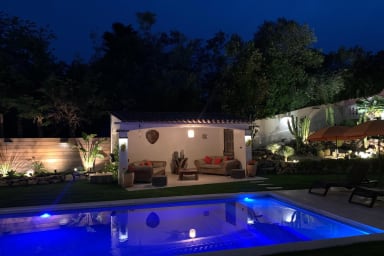 Un Pool house aménagée de salons de jardins, des transats, un terrain de pétanque, une table de ping-pong.