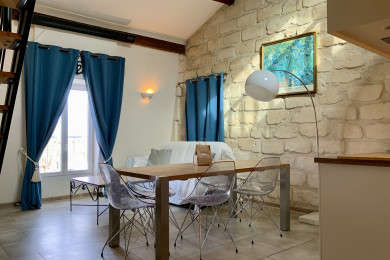 Il dispose d’une chambre avec un lit de 140 cm, ainsi que d’une mezzanine avec deux couchages de 70x190 cm. Le séjour offre une vue imprenable sur le Vieux Phare, le canal et la Maison du Dauphin, et comprend un coin cuisine entièrement équipé. Une salle de bain avec baignoire et un WC non séparé complètent l’aménagement.