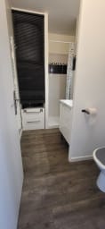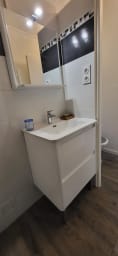 Côté salle de douche : douche, vasque avec meubles à tiroirs, Toilette .