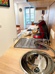 L'appartement est équipé d'une télévision Smart TV, du wifi, et de tous les équipements nécessaires pour passer un bon séjour tels qu'une machine à café Senseo, d'une, bouilloire, cuisine équipée pour deux personnes avec four micro ondes etc.
