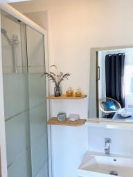 La salle de bain, attenante à la chambre, est conçue dans un esprit pratique et fonctionnel, avec une douche confortable et les équipements essentiels. Les WC sont situés séparément, pour un meilleur confort au quotidien.