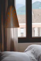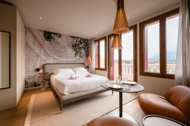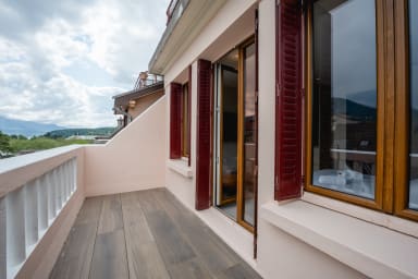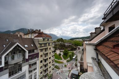 La pièce principale est équipée d'un lit en 160x200. Vous pourrez profiter de la terrasse après une belle journée au bord du lac ou en montagne avec sa vue imprenable sur le lac et la ville d'Annecy, au 8ème étage (ascenseur jusqu'au 7).