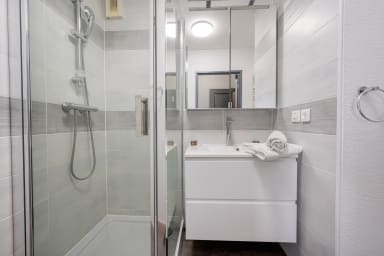 - D'une salle de bain avec baignoire, lavabo, WC séparé, sèche serviette, sèche cheveux