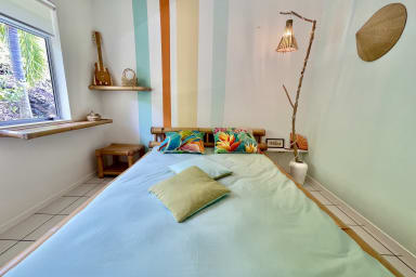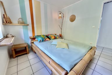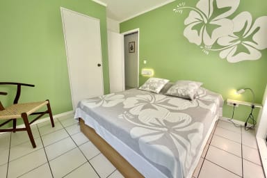 - La chambre parentale, la plus vaste possède un lit queen size, de grands placards, sa propre salle de bain avec douche et WC, un ventilateur de plafond rendant la chambre très agréable et une terrasse avec la vue sur le lagon.