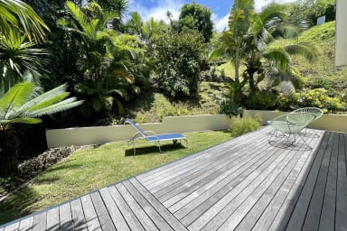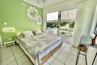 - La deuxième chambre, grise, décorée en ton sur ton de dessins d'hibiscus, est côté jardin et possède sa propre terrasse elle aussi.