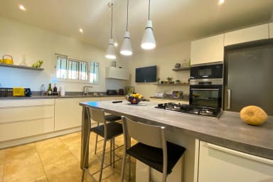 Cette maison de plain-pied d'une superficie de 120 m2 propose une cuisine entièrement équipée, comprenant des plaques de cuisson, un réfrigérateur, un congélateur, un four, un four à micro-ondes, une cafetière ainsi qu'un grille-pain. Le salon et la salle à manger, climatisés, sont meublés d'une grande table pour six personnes, d'un confortable canapé et de fauteuils, agrémentés d'une télévision.
