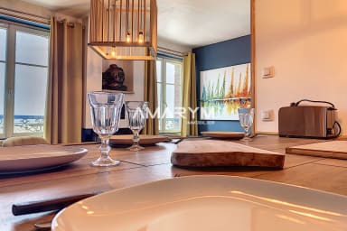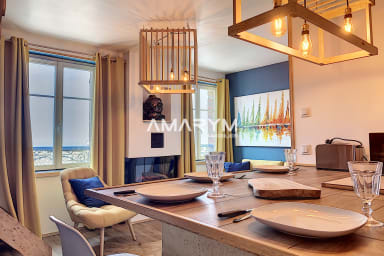 Le salon décoré avec soin, ainsi que la vue sur la mer, créent une ambiance apaisante, idéale pour vos soirées entre amis.