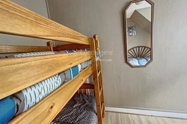 Une chambre confortable avec un lit double (160x200 cm) et un lit superposé.