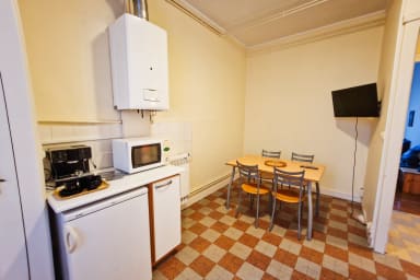 - une grande cuisine aménagée (four, micro-ondes, machine à café, bouilloire) avec table et chaises pour 4 personnes et une TV
