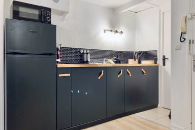 - d’une cuisine équipée (plaque, micro-ondes, cafetière, bouilloire, toaster...),
