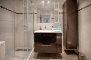 Doté d'une belle salle d'eau moderne avec douche à l'italienne, d'une cuisine semi fermée toute équipée et d'une belle pièce de vie ouvrant sur une terrasse avec une vue mer dégagée.