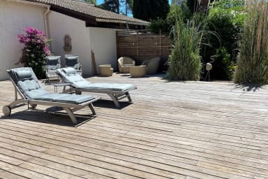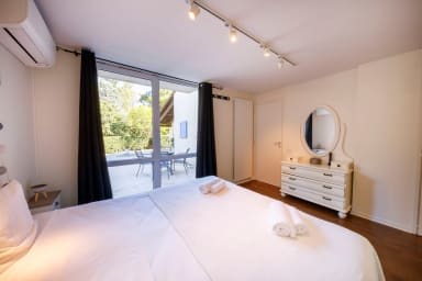 La villa se compose d'une belle pièce de vie avec cuisine équipée ouverte donnant sur la terrasse et le jardin. Elle dispose de 3 belles chambres avec chacune sa salle de bain et d'une mezzanine où un autre couchage est possible. L'une d'entre elle possède en plus un lit enfant. Un salon jeux, télé (avec PS4 jeux et DVD) et lecture se situe à l'étage.