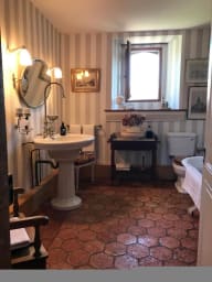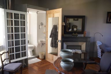 Véritable suite, la chambre est complétée par le salon bleu situé au rez de chaussé et donnant sur la piscine.