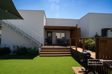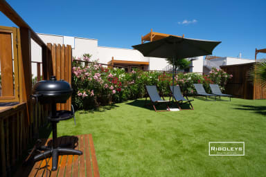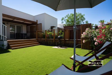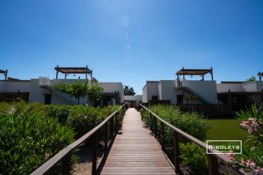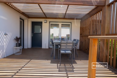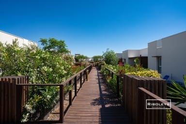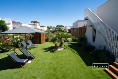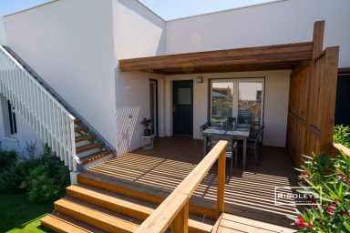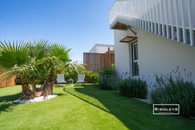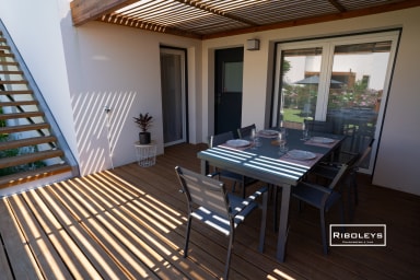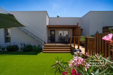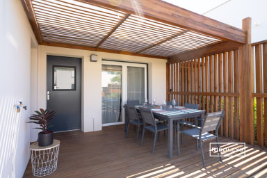 À l’extérieur, vous pourrez profiter d’une grande terrasse en bois ombragée de 17 m² ainsi que d’un jardin privatif spacieux, directement ouvert sur le cœur central de la résidence Marina Lodge, agrémenté de charmantes passerelles en bois. Le jardin est aménagé avec un salon de jardin, des bains de soleil, un parasol et un barbecue électrique, idéal pour vos repas et moments de détente en plein air.