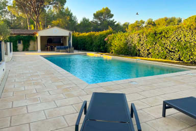 Votre Extérieure : La cuisine d'été invite aux barbecues entre amis ou en famille, dans un jardin paysager privatif et paisible. Profitez de baignades sereines dans notre grande piscine sécurisée, ou détendez-vous sur les transats sous le soleil éclatant de la Côte d'Azur. La villa inclut aussi 4 places de parking privées, pour une tranquillité d'esprit totale.