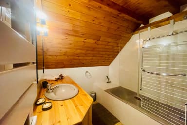 - Une chambre avec un lit double et, sur la mezzanine, 4 couchages : un lit double et deux lits simples