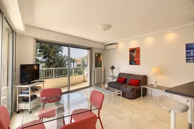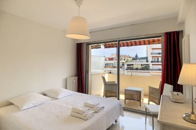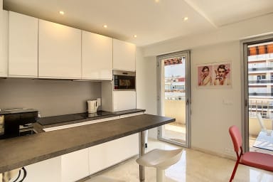 Ce bel appartement 2 pièces situé en étage élevé peut accueillir jusqu'à 4 personnes dans 3 lits différents. Entièrement équipé et climatisé. Il se compose d'un agréable séjour avec cuisine équipée ouverte, d'une chambre avec deux lits simples pouvant être réunis pour faire un lit double, d'une salle de bains et d'une terrasse d'angle. 2 min à pied de la Croisette, 8 min à pied du Palais.