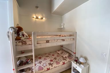 D'une superficie de 56 m2, cet appartement dispose d'une chambre avec deux lits superposés dotée également d'une mezzanine semi fermée avec un lit double (attention la hauteur sous plafond de la mezzanine est très basse et les déplacements debout sont impossibles). Vous aurez également une belle pièce de vie avec un canapé convertible pour deux personnes.