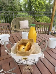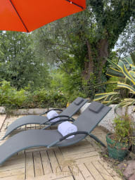 La terrasse ensoleillée, équipée d'un barbecue, est l'endroit idéal pour des repas en plein air et des soirées sous les étoiles, tout en admirant la vue imprenable sur les collines environnantes.