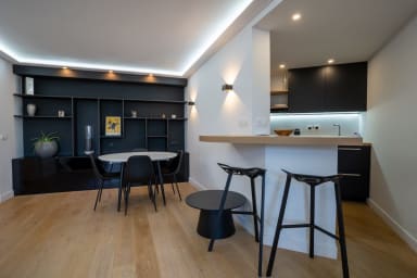 d'une cuisine ouverte avec lave vaisselle et lave linge, cafetière Nespresso