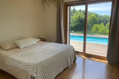 Une première chambre équipée d’un lit King-size 180x200 cm et avec vue piscine