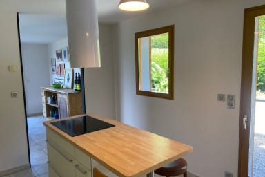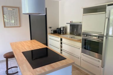 La cuisine, indépendante, est équipée de tous les équipements nécessaires et indispensables (four, four micro-ondes, réfrigérateur-congélateur, plaques de cuisson, lave-vaisselle, grille-pain, cafetière, bouilloire, vaisselle et ustensiles…) et flanquée d’un cellier/buanderie avec machine à laver.