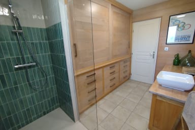 Une salle de bain avec douche italienne, meuble vasque et dressing
