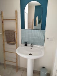 Ces deux dernières chambres se partagent l’accès à une petite salle de bain avec 2 éviers qui se font face et une douche.