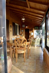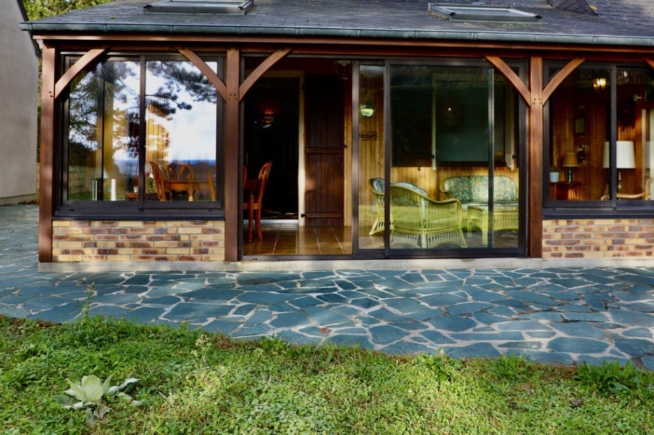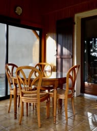 Une véranda prolonge cet espace et s’ouvre sur la terrasse et le jardin, créant un cadre idéal pour partager des repas et profiter de moments de détente.
