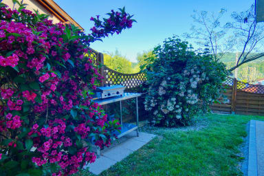 Le jardin clos comprend balançoire, toboggan et aromates à disposition.