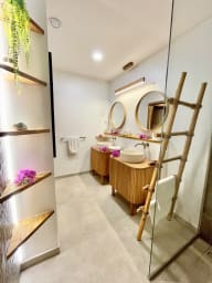 Le luxe ici, c’est l’espace et la douceur : une immense terrasse d’angle de 48 m², le ciel qui s’embrase au coucher du soleil, et votre jacuzzi Hydropool privatif (4 personnes), discrètement installé dans la verdure. Un vrai rituel de fin de journée : un bain chaud, le silence, les lumières de la côte au loin.