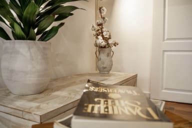 L'appartement a été décoré avec goût. Son ambiance mêlant le bois, le blanc et la pierre créent une ambiance cosy dont on ne se lasse pas.