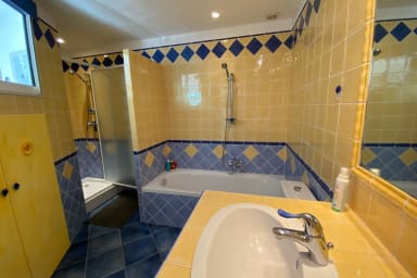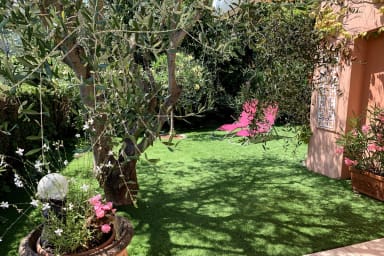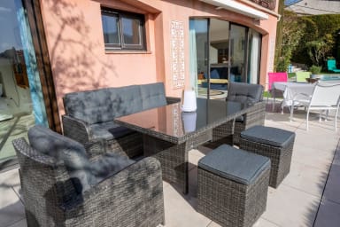 Enfin, au rez-de-jardin, vous aurez l'équivalent d'un appartement indépendant avec une cuisine ouverte entièrement équipée et un salon/salle à manger avec accès direct sur la terrasse équipée, le jardin et la piscine en mosaïque.