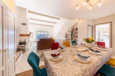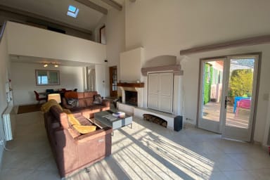 La villa est composée de 3 niveaux. Vous aurez au rez-de-chaussée un vaste salon avec cheminée avec une table à manger permettant d’accueillir 10 personnes, une cuisine fermée entièrement équipée, une chambre avec sa salle d'eau et WC privatifs et un WC d'invités.