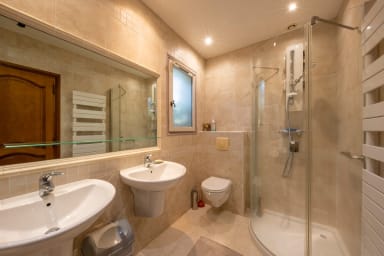 A ce niveau, vous trouverez également 2 chambres indépendantes avec chacune sa salle de bain et ses WC ; l’une d’elle est très spacieuse et pourra facilement accueillir un couple et son enfant (un lit bébé et une chaise haute sont à disposition). Les lits sont de très bonne qualité avec la possibilité de transformer les lits 180cm en deux lits de 90cm.