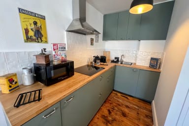 La cuisine, un véritable hymne à la fonctionnalité, est équipée pour répondre à tous vos besoins : des ustensiles de cuisine aux dernières technologies comme la plaque à induction, un grille-pain, un micro-ondes, ainsi qu'une cafetière Nespresso et une bouilloire pour vos matins en douceur. Et pour faciliter votre séjour, une machine à laver séchante est également à votre disposition.